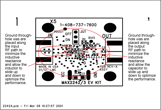 良好的接地需确保地平面尽可能连续,顶层地平面与底层的地平面应该利用多个镀金过孔连接。MAX2242有三个接地引脚:GND1、GND2和GND3。为了使感抗最小,这三个引脚接地的过孔位置要离器件尽可能近。MAX2242评估板上使用10mil镀金过孔接地,这些接地过孔的边缘与PA三个接地引脚的边缘距离为4mil。