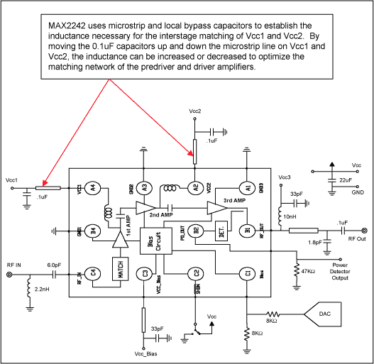 由于级间匹配使部分匹配,多级放大器的外部级间匹配非常严格。为优化前级驱动和驱动放大器需要少量的电感,集总参数形式或分布参数形式均可。