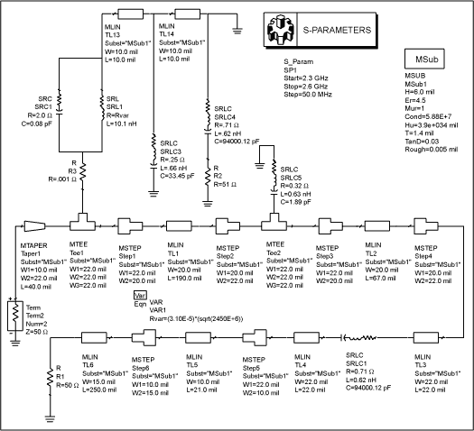 图3和图4所示为按照实际电路板尺寸得到的集总和分布元件模型,它们组成了最佳输入输出匹配网络。